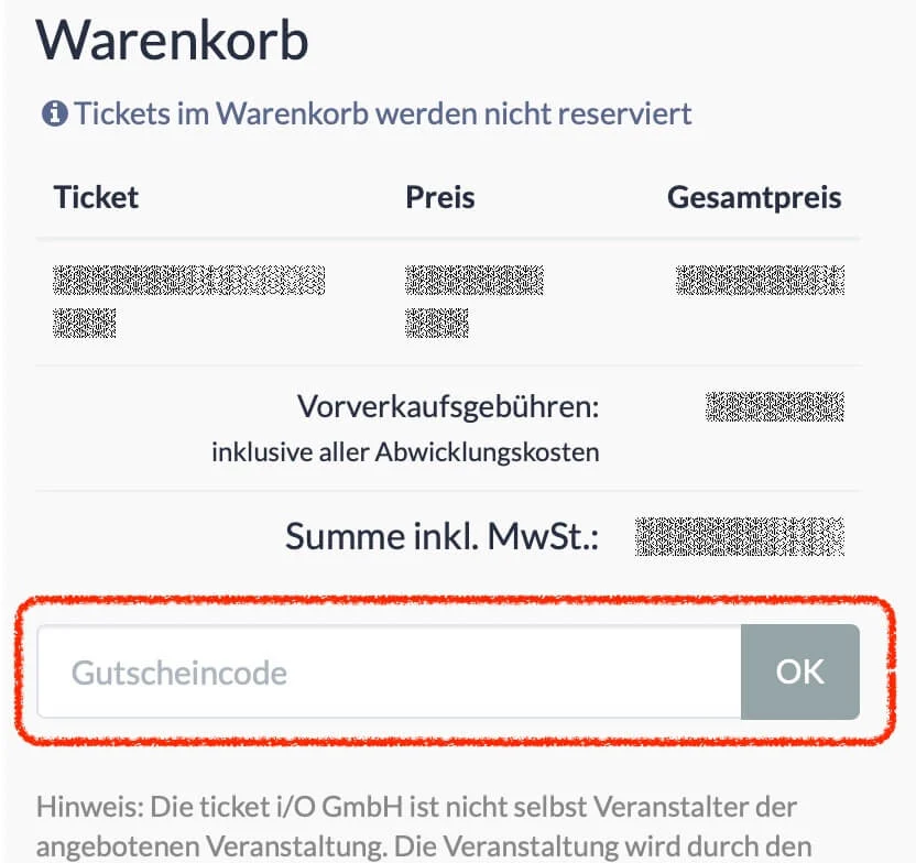 Sollte Ihr Gutschein-Betrag nicht abgezogen werden, fahren Sie bitte nicht mit der Bestellung fort. Eine nachträgliche Anrechnung/Gutschrift ist NICHT möglich. Wenden Sie sich bitte direkt an unseren Ticket-Dienstleister ticket.io (hier klicken).